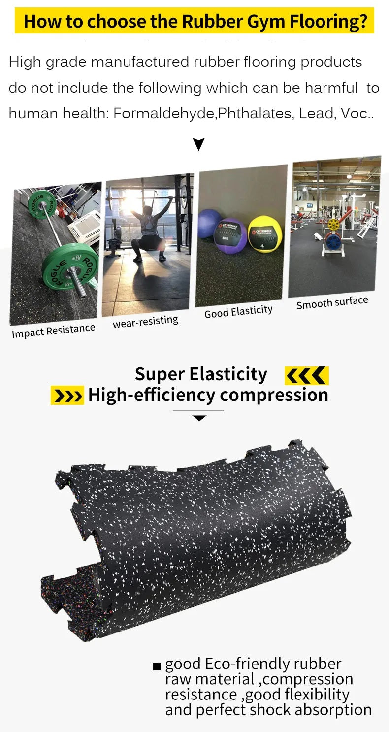 - Caoutchouc de haute qualité – Ces tapis de sol de salle de sport sont fabriqués en caoutchouc haute densité. Un tapis de gymnastique pèse 11 kg, offre un excellent soutien et un excellent coussin ; Ne contient aucun phtalate toxique. Et aussi facile à nettoyer avec un chiffon